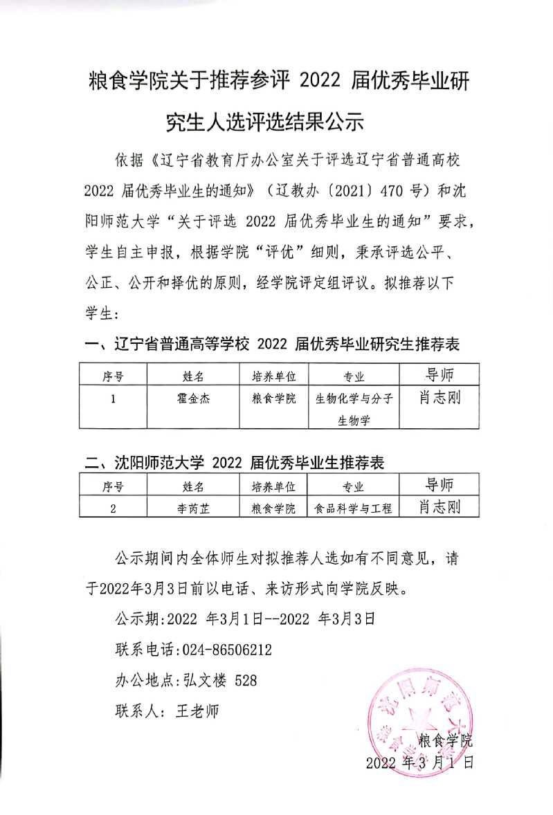 关于推荐参评 2022 届优秀毕业研究生人选评选结果公示