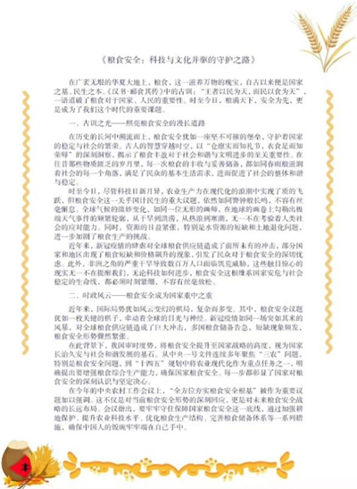 为落实“强法治、保供给、护粮安”安全宣传周主题,激发同学们从不同角度、不同方面阐发自己的观点,汇聚起保障粮食安全的磅礴力量,伟德国际bevictor1946举办“粮满天下,安全为先”主题征文活动,本次活动为粮食安全贡献出中国智慧与中国方案,展现出我国在保障粮食安全方面的生动实践、感人故事及未来展望,并立足粮食安全现状,强调法治保障在粮食安全的核心地位和重要意义。伟德国际bevictor1946旨在号召广大青年对保卫国家粮食安全付诸实际行动,让同学们能够通过文字的力量,深入挖掘粮食安全的多元特点。